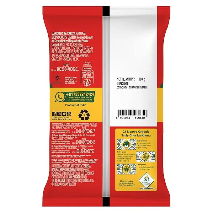 Fenugreek seeds organic or methi seeds whole are commonly known as Methi and is used regularly in Indian food preparation. The Fenugreek seeds or Methi seeds , its ground powder are used in pickles, curries and as a condiment. India is the major producer of fenugreek or methi and it is used both for culinary and medicinal purposes. 24 Mantra Organic Fenugreek seeds organic or methi seeds is unadulterated and has a strong spicy flavor typical for Fenugreek!